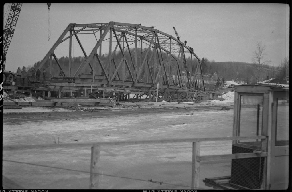 Montage de la structure métallique du pont sur le Bras-du-Sud du Lac Wakefield à Saint-Pierre-de-Wakefield, 1955, Archives nationales à Québec, Fonds Ministère de la Culture et des Communications, (03Q,E6,S7,SS1,D2494,P497-55H), Émile Laurence.