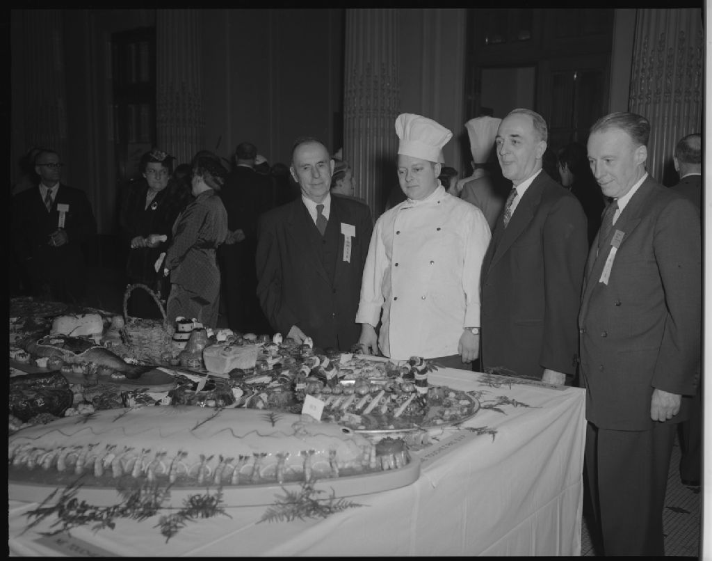 Salon culinaire tenu au Café du Parlement, Québec, 1955, Archives nationales à Québec, Fonds Ministère de la Culture et des Communications, (03Q,E6,S7,SS1,D2496,P566-55H), Neuville Bazin.