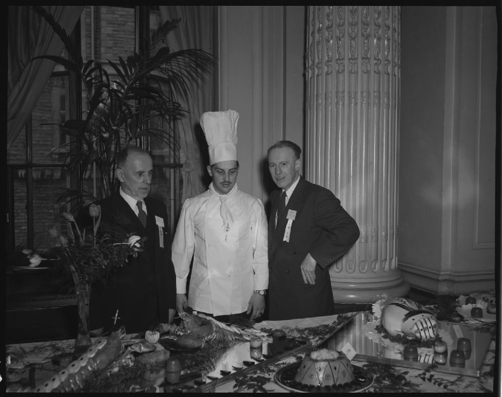 Salon culinaire tenu au Café du Parlement, Québec, 1955, Archives nationales à Québec, Fonds Ministère de la Culture et des Communications, (03Q,E6,S7,SS1,D2496,P567-55H), Neuville Bazin.