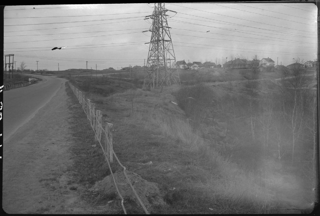 Terrain de stationnement à l'entrée du pont de l'Île Maligne, 1955, Archives nationales à Québec, Fonds Ministère de la Culture et des Communications, (03Q,E6,S7,SS1,D2504,P661-55H), L.-E. Beaulieu.
