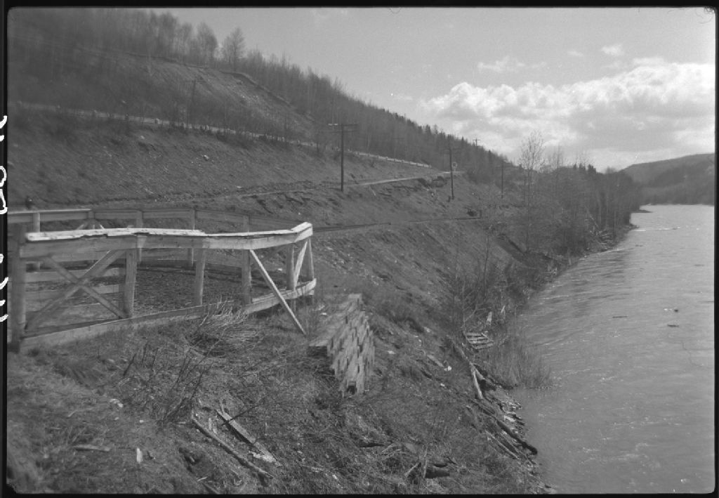 Mur de soutènement, côté nord de la voie ferrée du Canadian National Railway (C.N.R.) à Saint-Alexis-de-Matapédia, 1955, Archives nationales à Québec, Fonds Ministère de la Culture et des Communications, (03Q,E6,S7,SS1,D2566,P1160-55H), Marcel Gagnon.
