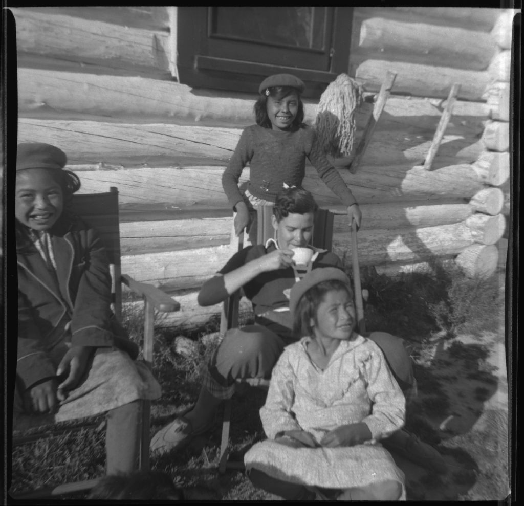 [Jeune femme prenant le thé avec des enfants amérindiens]. Grand Lac Mistassini, 1955, Archives nationales à Québec, Fonds Ministère de la Culture et des Communications, (03Q,E6,S7,SS1,D2585,P1315-55H), P. Côté.