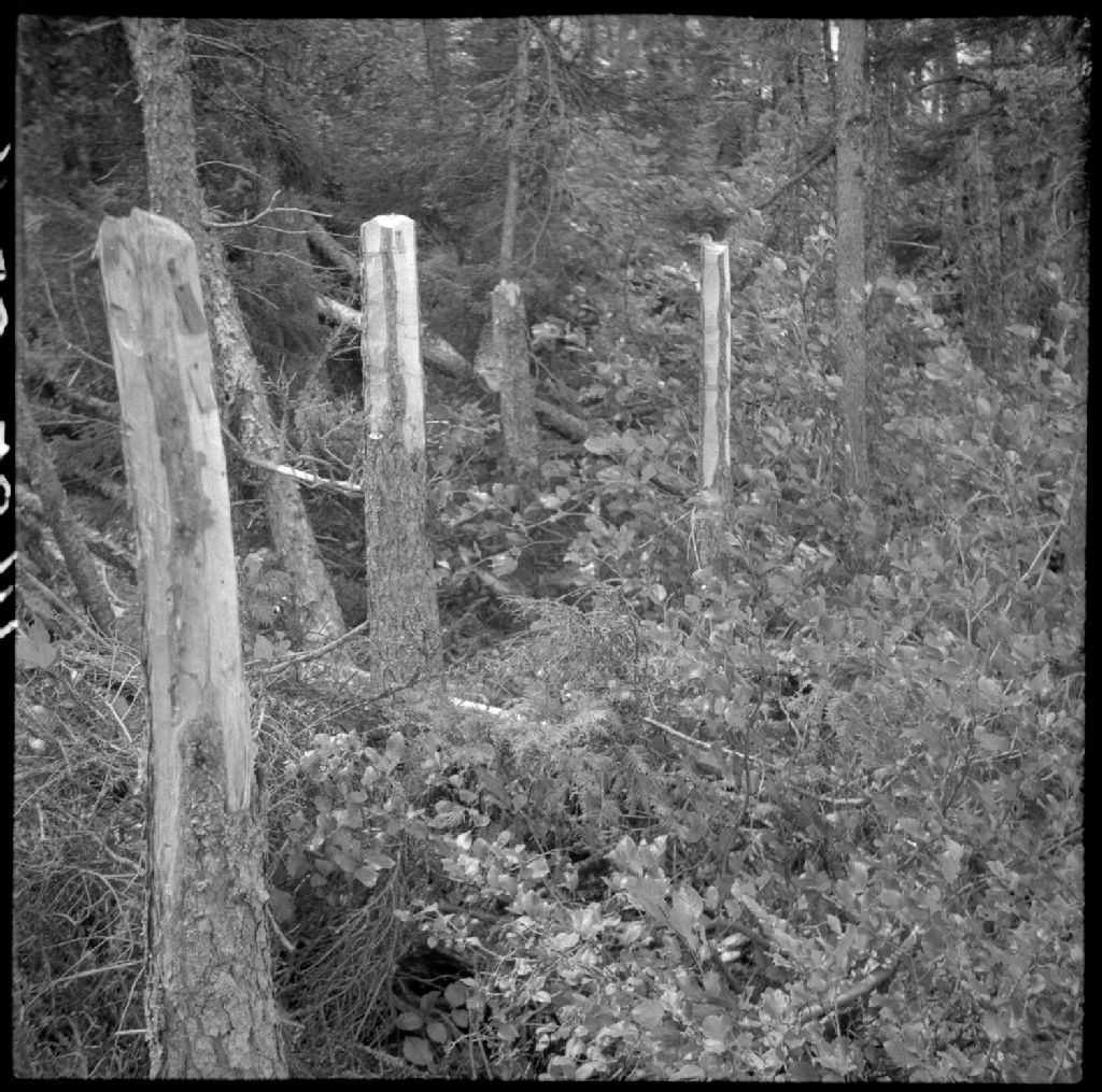 Piquets de claim se trouvant sur des lots claimés dont voici les poteaux indicateurs dans une des îles du lac Matagami, Rivière Bell, 1955, Archives nationales à Québec, Fonds Ministère de la Culture et des Communications, (03Q,E6,S7,SS1,D7,P1457-55H), Camille Laverdière.