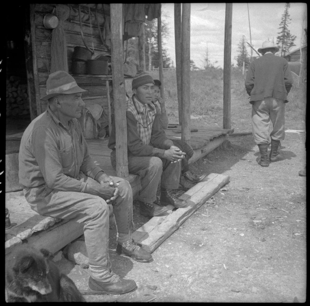 Un amérindien et deux de ses enfants dans sa cabane de bois rond sur une île du lac Matagami, Rivière Bell
