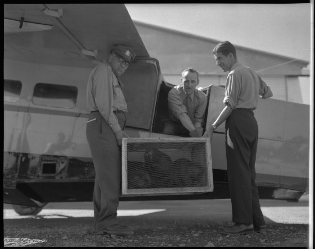 Transport de castors de Haldimand à Bersimis, 1955, Archives nationales à Québec, Fonds Ministère de la Culture et des Communications, (03Q,E6,S7,SS1,D2603,P1465-55H), Gustave Bédard.