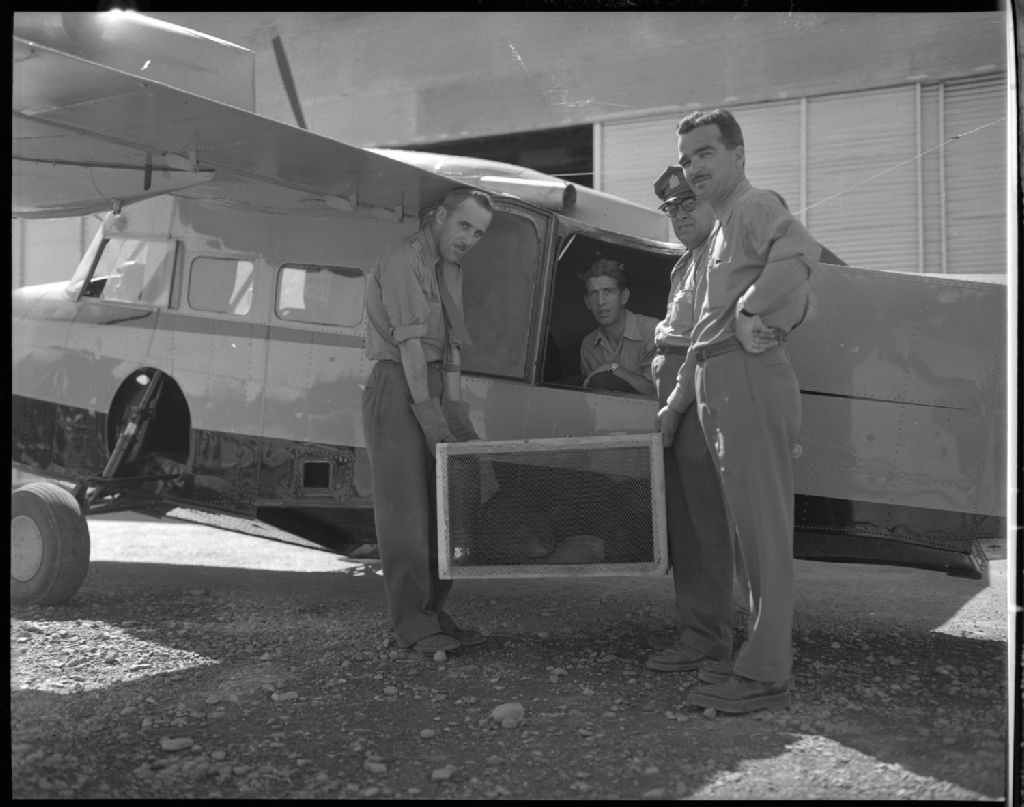 Transport de castors de Haldimand à Bersimis, 1955, Archives nationales à Québec, Fonds Ministère de la Culture et des Communications, (03Q,E6,S7,SS1,D2603,P1466-55H), Gustave Bédard.