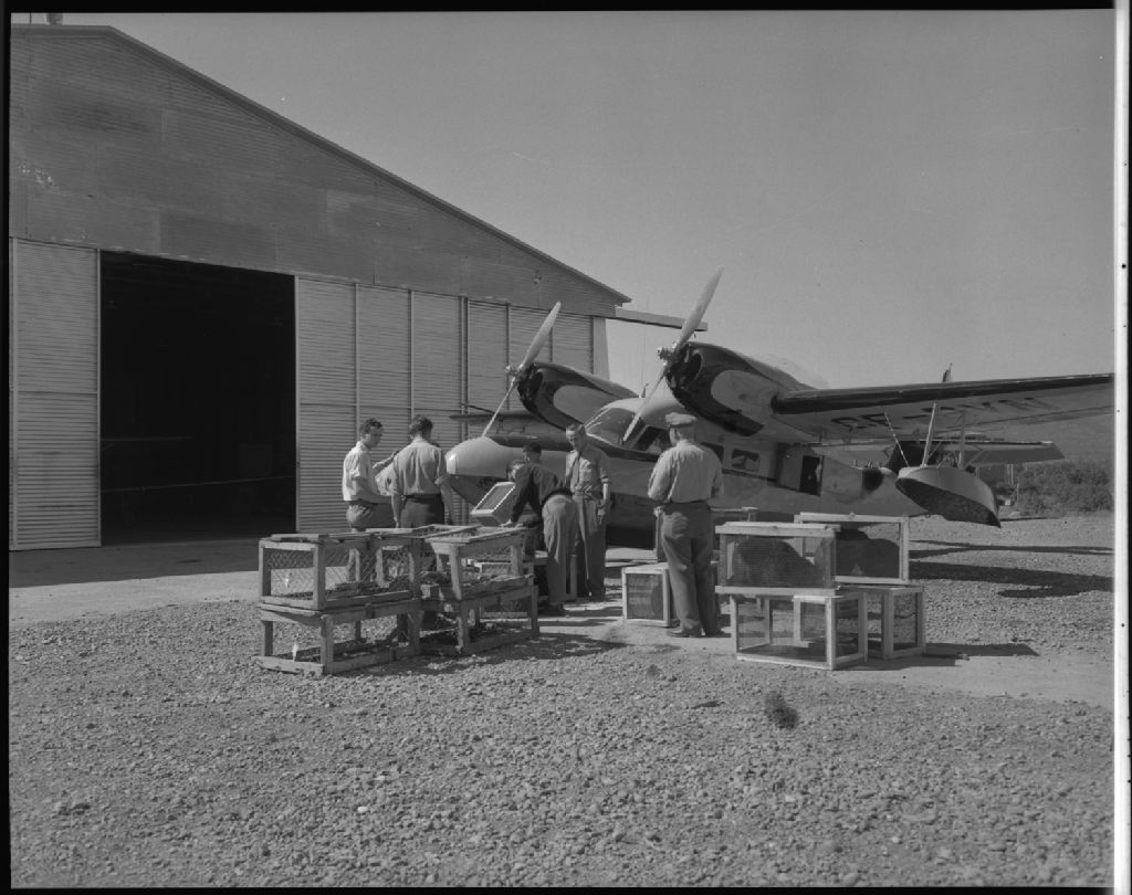 Transport de castors de Haldimand à Bersimis, 1955, Archives nationales à Québec, Fonds Ministère de la Culture et des Communications, (03Q,E6,S7,SS1,D2603,P1472-55H), Gustave Bédard.