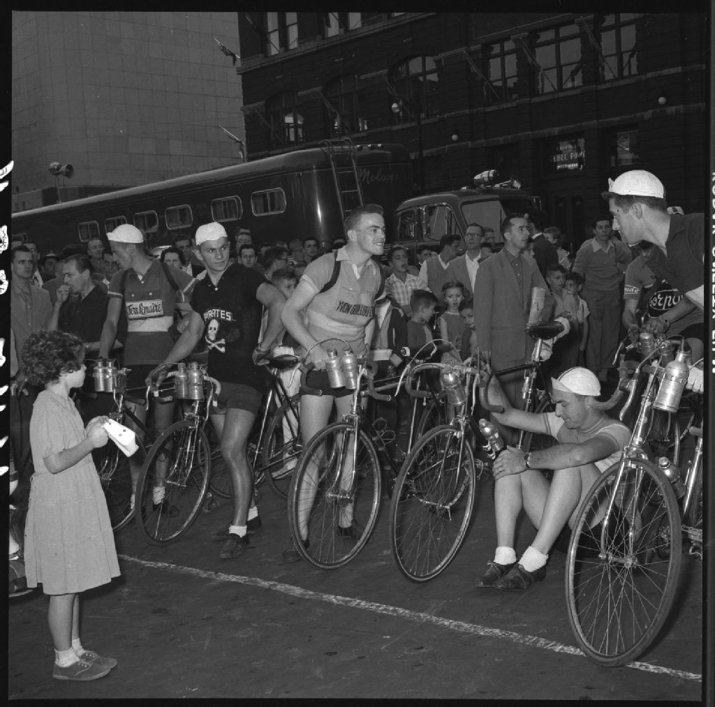 Les coureurs avant le départ pour le Tour du Saint-Laurent cycliste. Assis; Pat Murphy, Jos. Toulgoat et Beaudy. Carré Jacques-Cartier, Québec