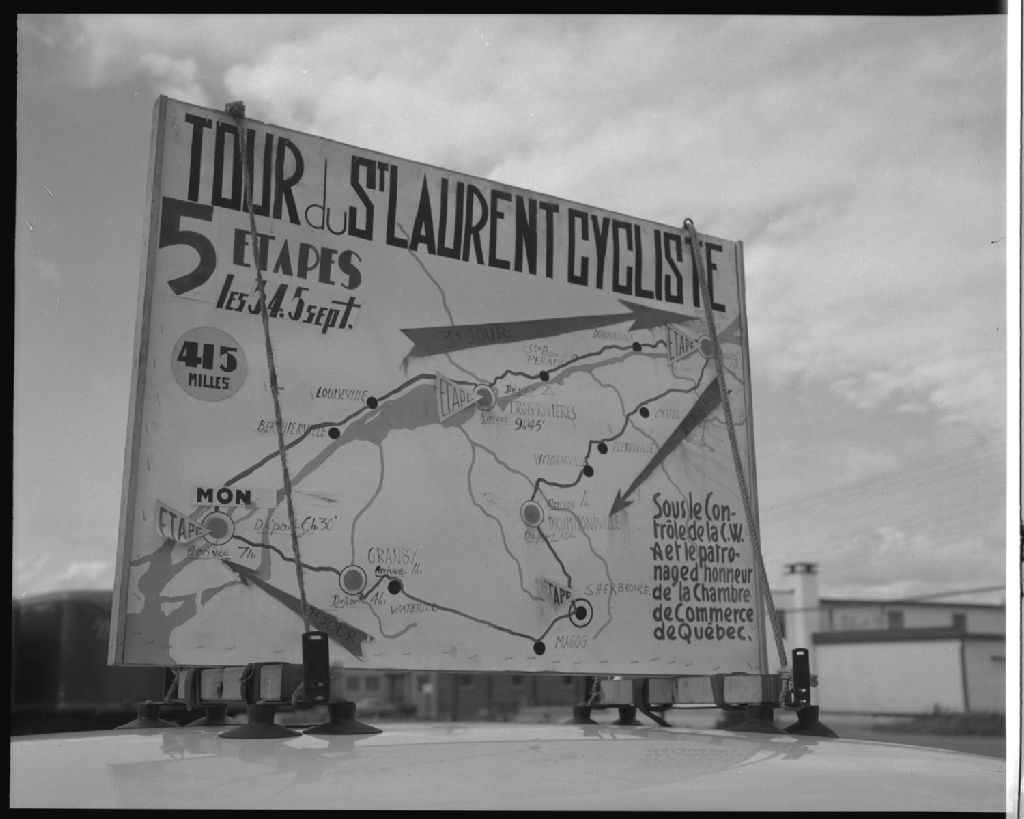La carte du Tour du Saint-Laurent cycliste. Dumais Ltée, Québec, 1955, Archives nationales à Québec, Fonds Ministère de la Culture et des Communications, (03Q,E6,S7,SS1,D2630,P1651-55H), Neuville Bazin.