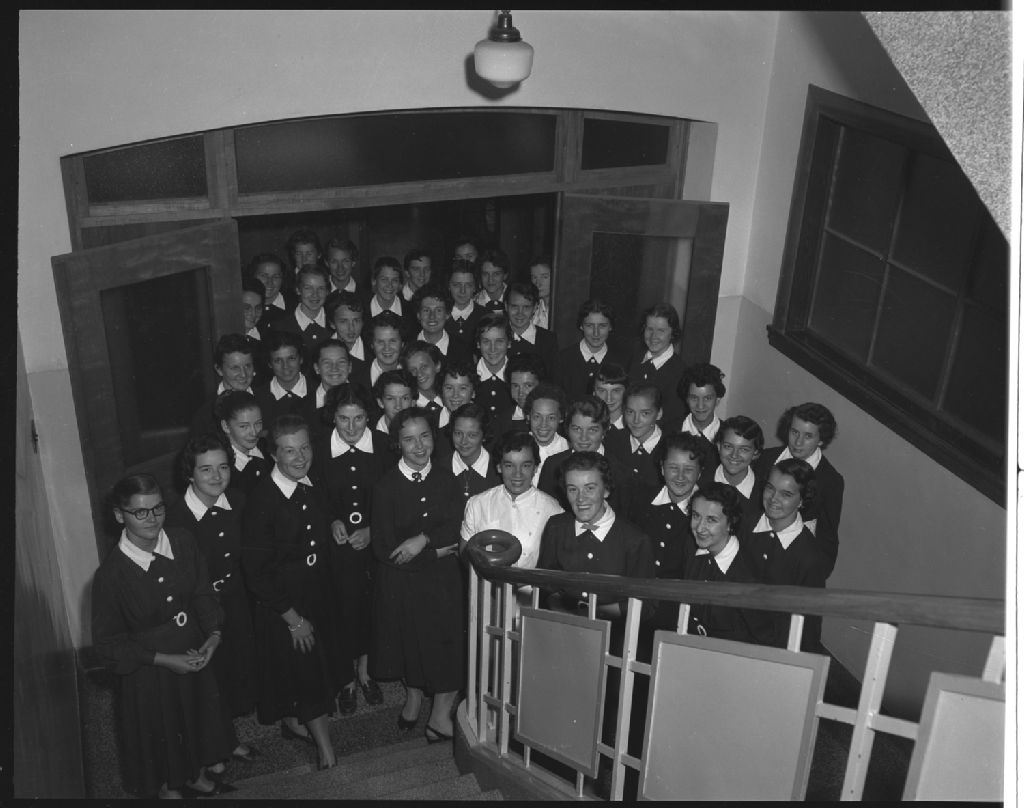 Visite des boursiers du Pakistan dans le cadre du plan de développement économique Colombo. École primaire rurale Sainte-Monique-des-Saules et Institut familial de Loretteville, 1955, Archives nationales à Québec, Fonds Ministère de la Culture et des Communications, (03Q,E6,S7,SS1,D2627,P1672-55H), Neuville Bazin.