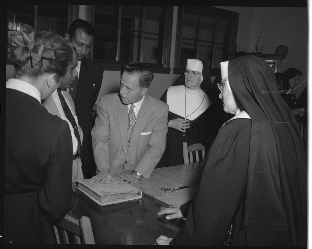 Visite des boursiers du Pakistan dans le cadre du plan de développement économique Colombo. École primaire rurale Sainte-Monique-des-Saules et Institut familial de Loretteville, 1955, Archives nationales à Québec, Fonds Ministère de la Culture et des Communications, (03Q,E6,S7,SS1,D2627,P1674-55H), Neuville Bazin.