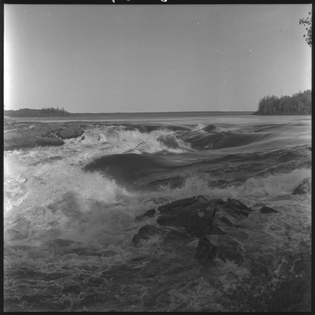 Le rapide de la Chute-Rouge sur la rivière Waswanipi entre les lacs Olga et Matagami. Chute-Rouge, comté Abitibi-Est, 1955, Archives nationales à Québec, Fonds Ministère de la Culture et des Communications, (03Q,E6,S7,SS1,D2659,P1989-55H), P. Chouinard.