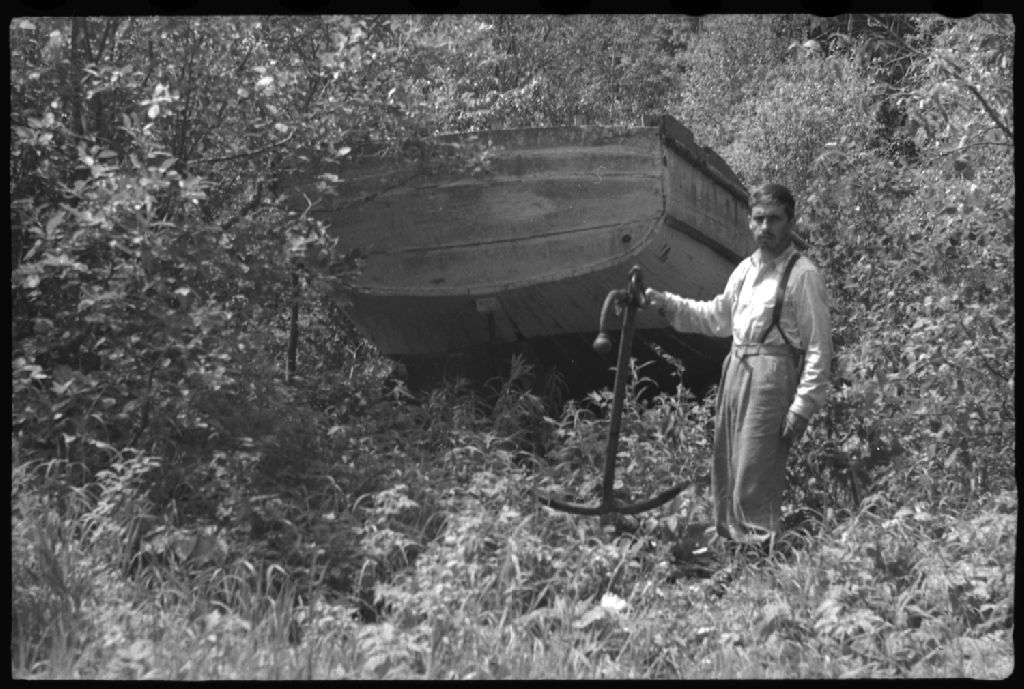 Bateau abandonné par la Kerwin sur la rivière Bell aux rapides Petits-Kiask. Rivière-Bell, comté Abitibi-Est, 1955, Archives nationales à Québec, Fonds Ministère de la Culture et des Communications, (03Q,E6,S7,SS1,D2659,P2009-55H), P. Chouinard.
