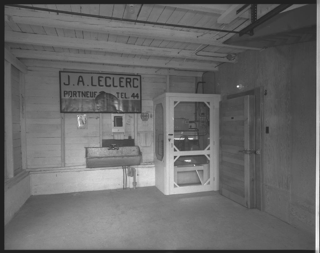 Intérieur de l'entrepôt frigorifique d'Alcide Leclerc, détaillant de poissons à Portneuf, 1955, Archives nationales à Québec, Fonds Ministère de la Culture et des Communications, (03Q,E6,S7,SS1,D2667,P2024-55H), Gustave Bédard.