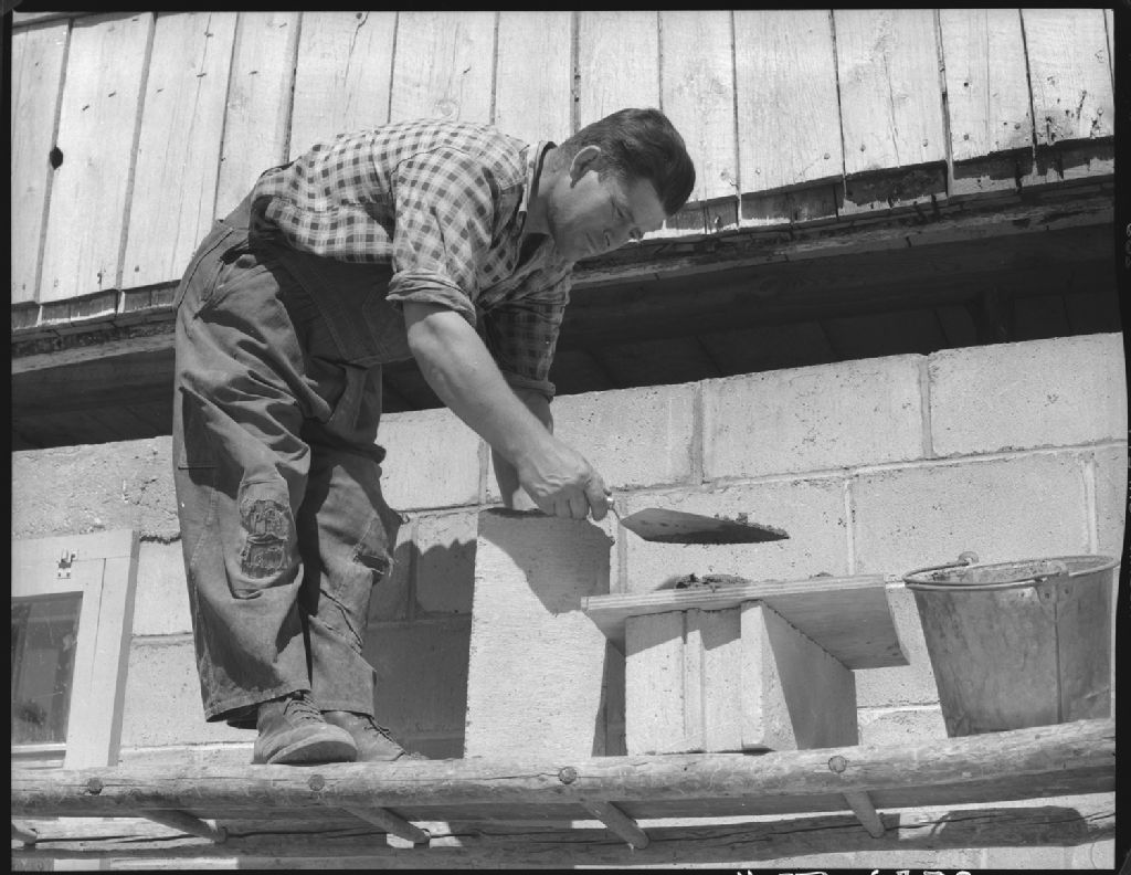 Roland Ouellette monte ses blocs de ciment pour son mur de grange à Saint-Janvier, comté de Terrebonne, 1955, Archives nationales à Québec, Fonds Ministère de la Culture et des Communications, (03Q,E6,S7,SS1,D7,P2783-55H), Omer Beaudoin.