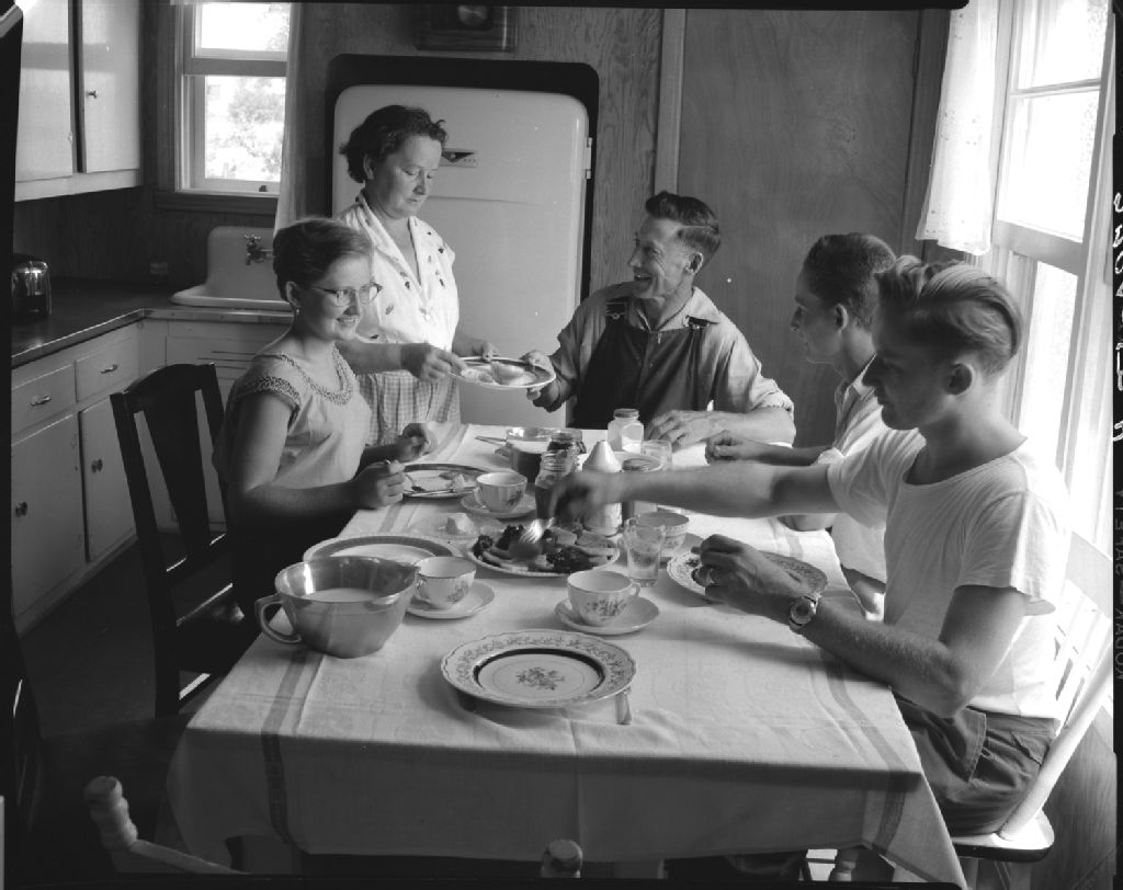 Dans la cuisine chez Léopold Corbeil, on se met à table. Saint-Antoine-des-Laurentides, comté de Terrebonne