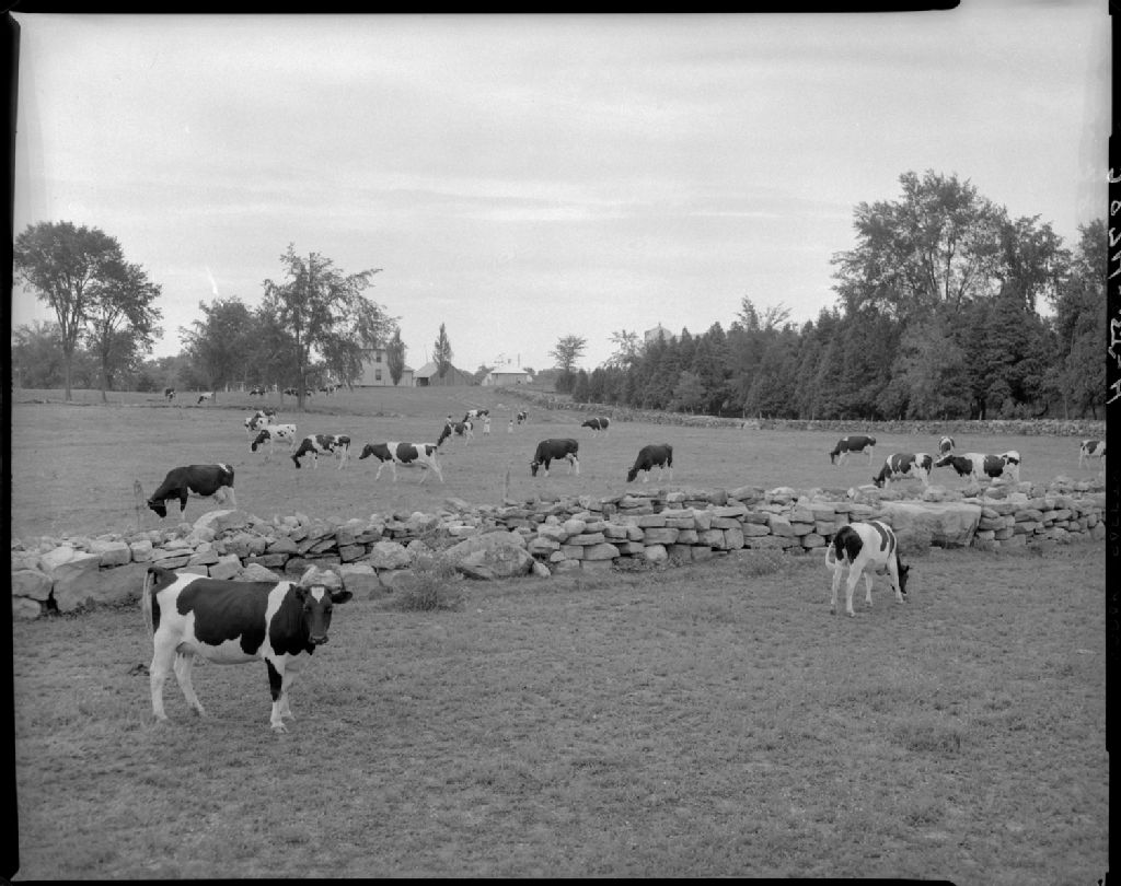 Troupeau au pâturage chez Zéphirin Brisson à Sainte-Barbe, comté de Huntingdon, 1955, Archives nationales à Québec, Fonds Ministère de la Culture et des Communications, (03Q,E6,S7,SS1,D7,P2874-55H), Omer Beaudoin.