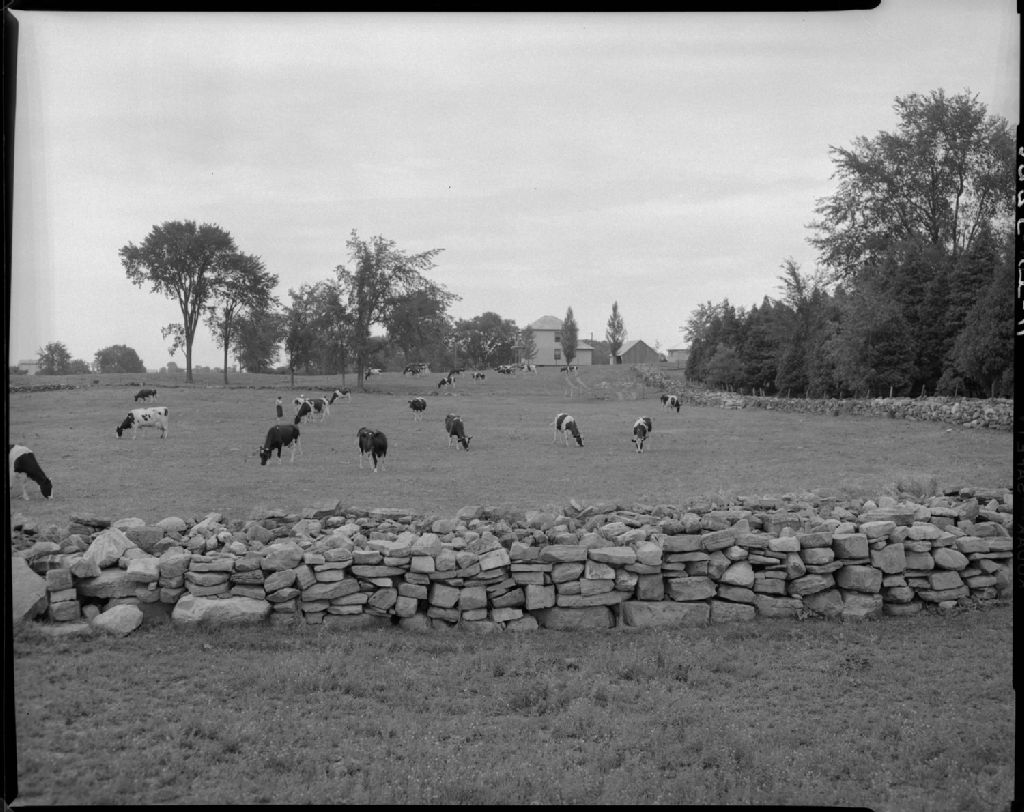 Troupeau au pâturage et ensemble de ferme chez Zéphirin Brisson à Sainte-Barbe, comté de Huntingdon