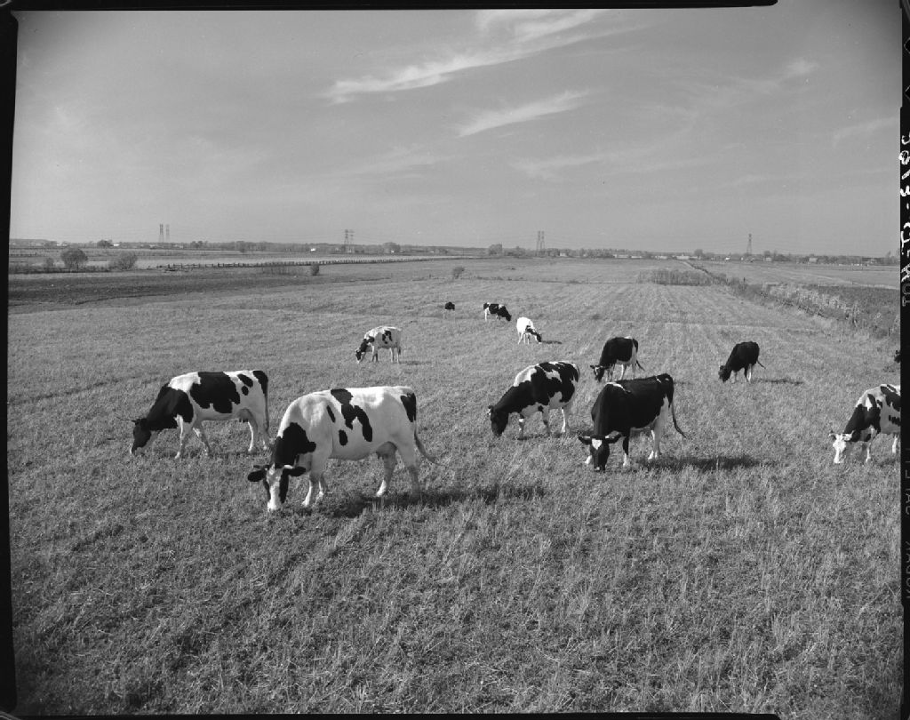 Troupeau dans les champs d'Hormidas Payette à L'Épiphanie, comté de l'Assomption, 1955, Archives nationales à Québec, Fonds Ministère de la Culture et des Communications, (03Q,E6,S7,SS1,D7,P2913-55H), Omer Beaudoin.