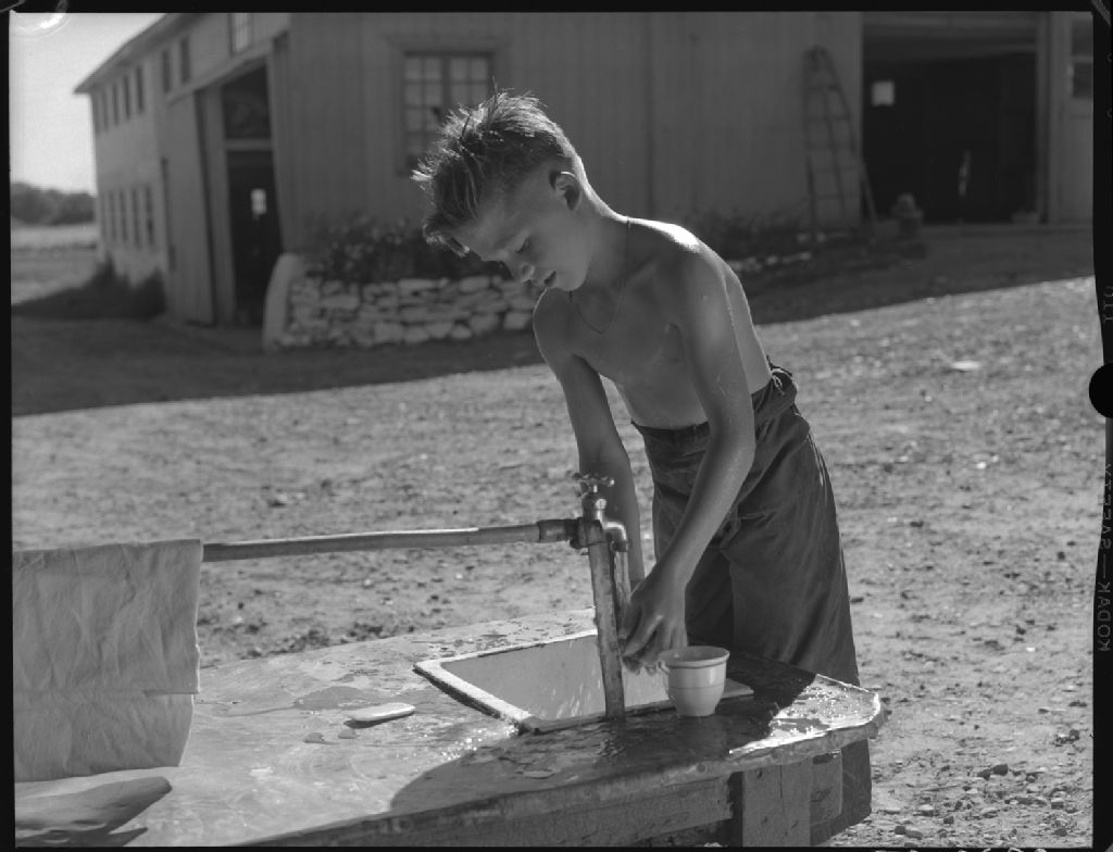 Garçonnet qui se lave au robinet extérieur chez Georges-Émile Charron à Sainte-Thérèse, comté de Terrebonne, 1955, Archives nationales à Québec, Fonds Ministère de la Culture et des Communications, (03Q,E6,S7,SS1,D7,P2930-55H), Omer Beaudoin.