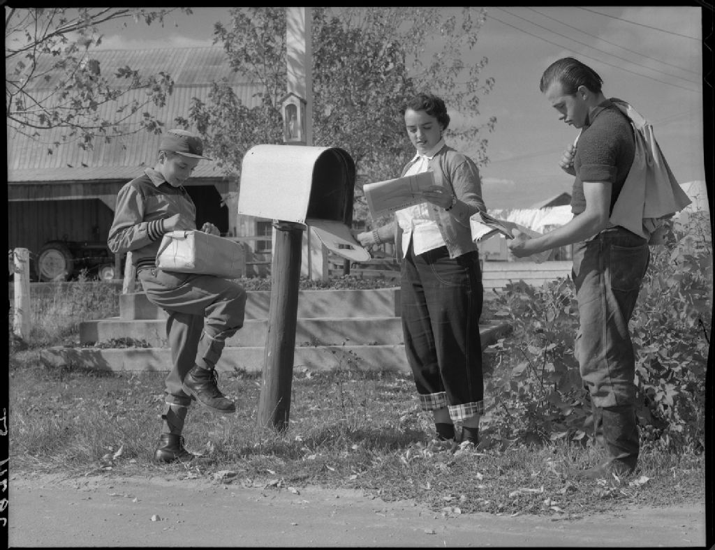 Jeunes gens à la boîte aux lettres chez Fortunat Archambault à Saint-Paul-l'Ermite, comté de l'Assomption, 1955, Archives nationales à Québec, Fonds Ministère de la Culture et des Communications, (03Q,E6,S7,SS1,D7,P2974-55H), Omer Beaudoin.