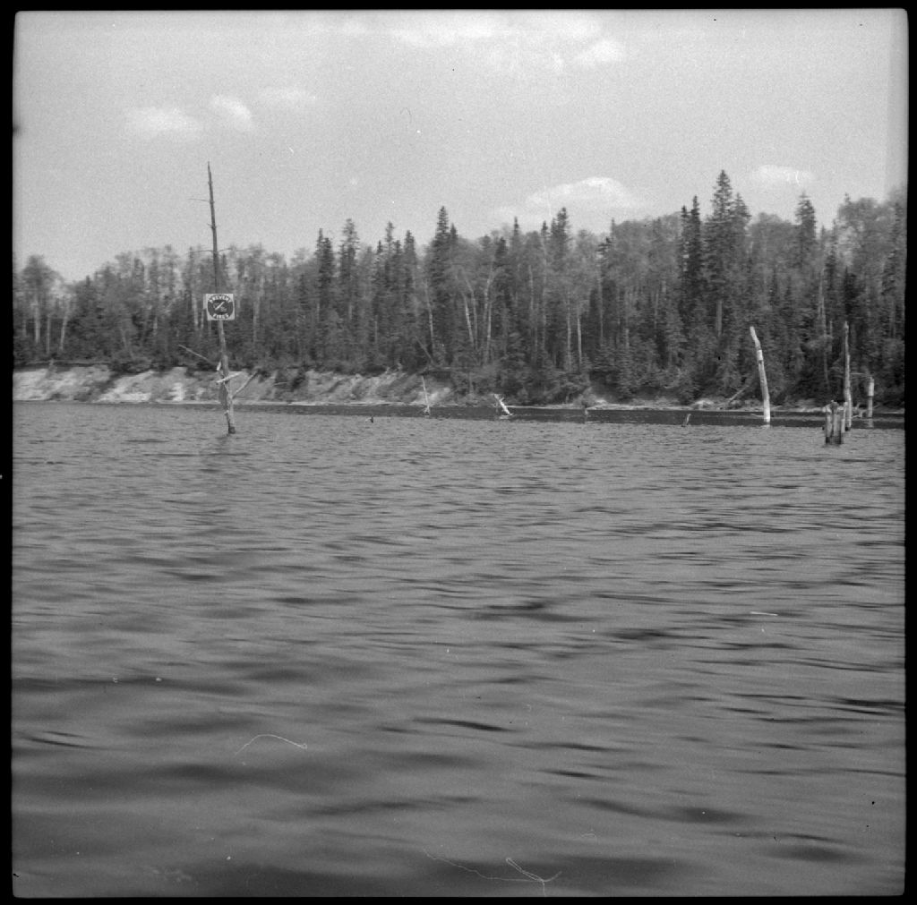 Berges vives sapées par les eaux du réservoir. Les rives du réservoir ont cet aspect par suite du relèvement des eaux. Réservoir Gouin, 1955, Archives nationales à Québec, Fonds Ministère de la Culture et des Communications, (03Q,E6,S7,SS1,D7,P3267-55H), Camille Laverdière.