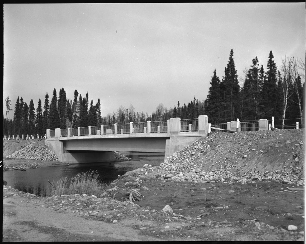 Pont sur la rivière Chibougamau, comté d'Abitibi-Est, 1955, Archives nationales à Québec, Fonds Ministère de la Culture et des Communications, (03Q,E6,S7,SS1,D7,P3346-55H), Paul Carpentier.