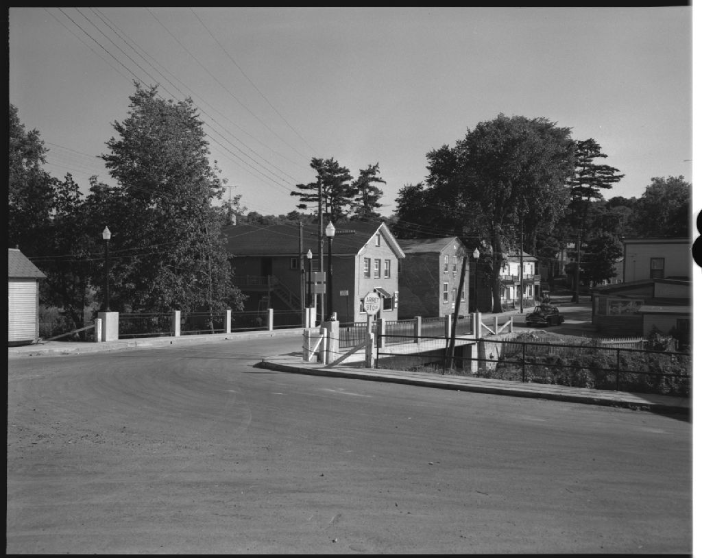 Pont sur la rivière aux Brochets à Frelighsburg, comté de Missisquoi, 1955, Archives nationales à Québec, Fonds Ministère de la Culture et des Communications, (03Q,E6,S7,SS1,D7,P3523-55H), Paul Carpentier.