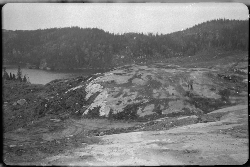 Décapage du gisement d'ilmenite au contact de l'anorthosite, Mine Tio, Quebec Iron & Titanium Co.