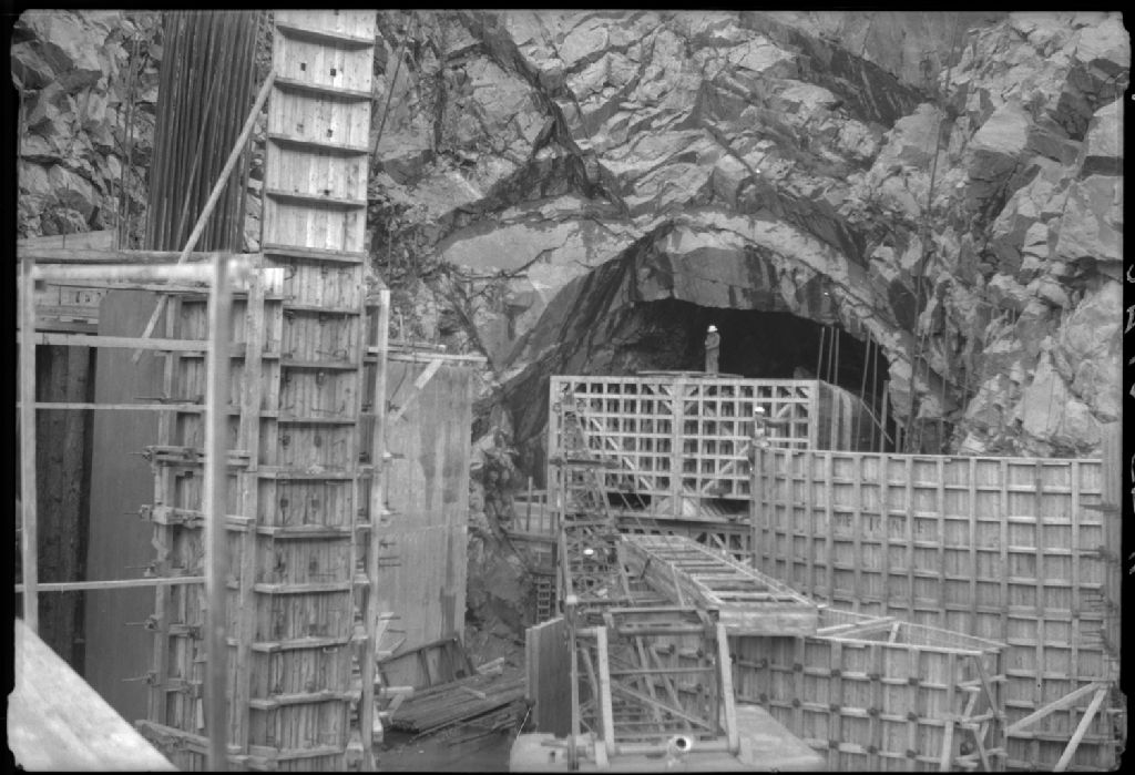 Vue de la construction du tunnel d'alimentation sur la rivière Desroches pour la centrale hydroélectrique de Labrieville, Côte-Nord, 1955, Archives nationales à Québec, Fonds Ministère de la Culture et des Communications, (03Q,E6,S7,SS1,D7,P3712-55H), M. Morin.