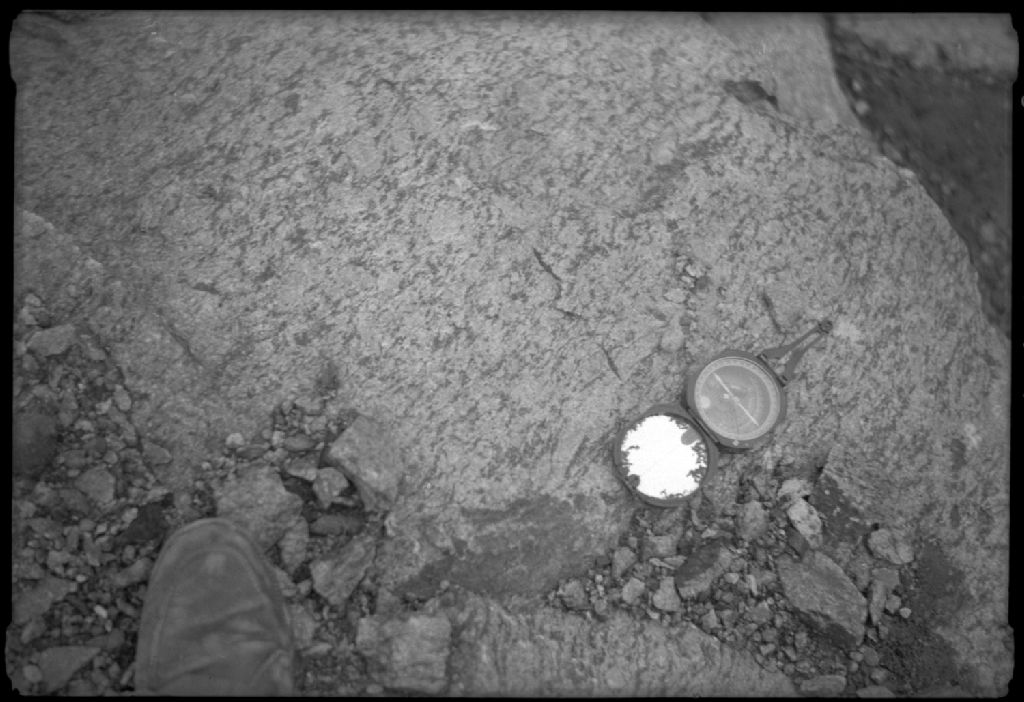 Géologie - Gneiss oeillé près de la faille de Moose Creek sur la route du lac Cassé, région de Labrieville, Côte-Nord, 1955, Archives nationales à Québec, Fonds Ministère de la Culture et des Communications, (03Q,E6,S7,SS1,D7,P3714-55H), M. Morin.