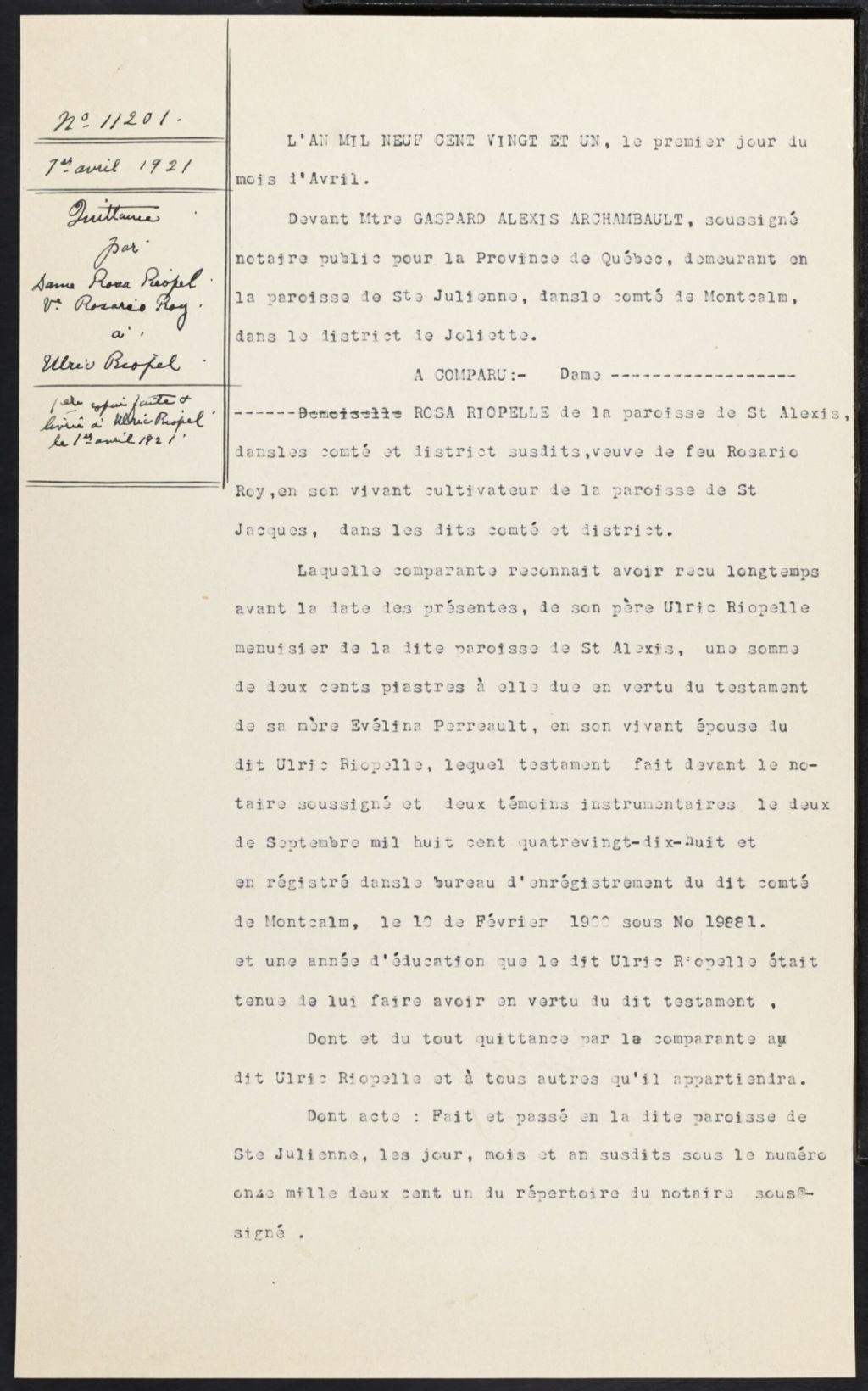 - Les minutes du notaire Gaspard Alexis Archambault reflètent les activités de la population de Saint-Alphonse-de-Rodriguez où il a pratiqué de 1884 à 1888, et de Sainte-Julienne de 1888 à 1924, où il a terminé sa carrière. À noter qu'il a signé son premier acte (testament d'une résidante de Saint-Alexis, comté de Montcalm) alors qu'il résidait à Montréal.
