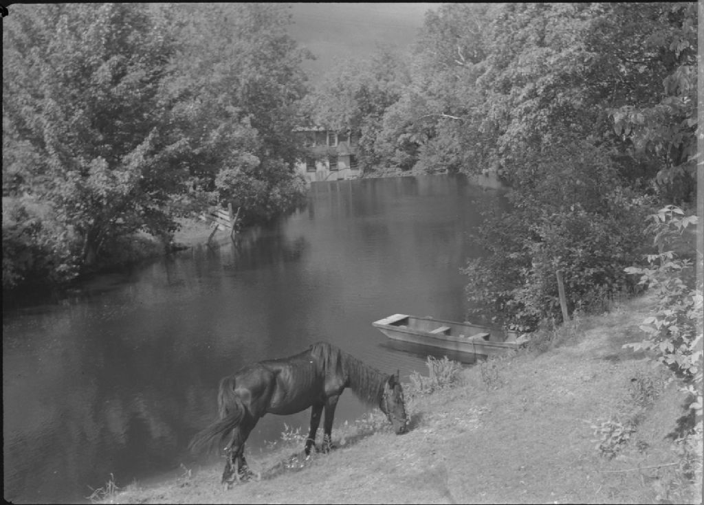 Un cheval broute sur les bords d'une rivière. Un chaland, un vieux moulin. Beaumont, Vers 1950, Archives nationales à Québec, Fonds George A. Driscoll, (03Q,P630,S1,D88651), George A. Driscoll.