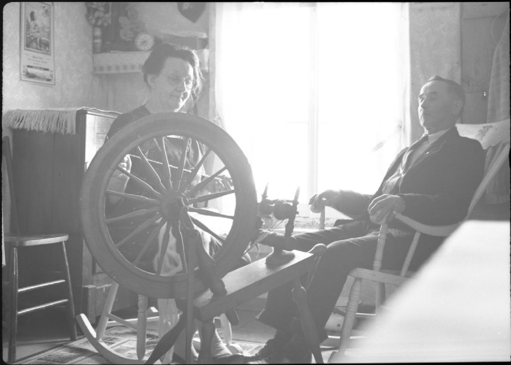 - 1. Couple au salon, madame au rouet, monsieur dans une chaise berçante2. Femme qui file de la laine au rouet