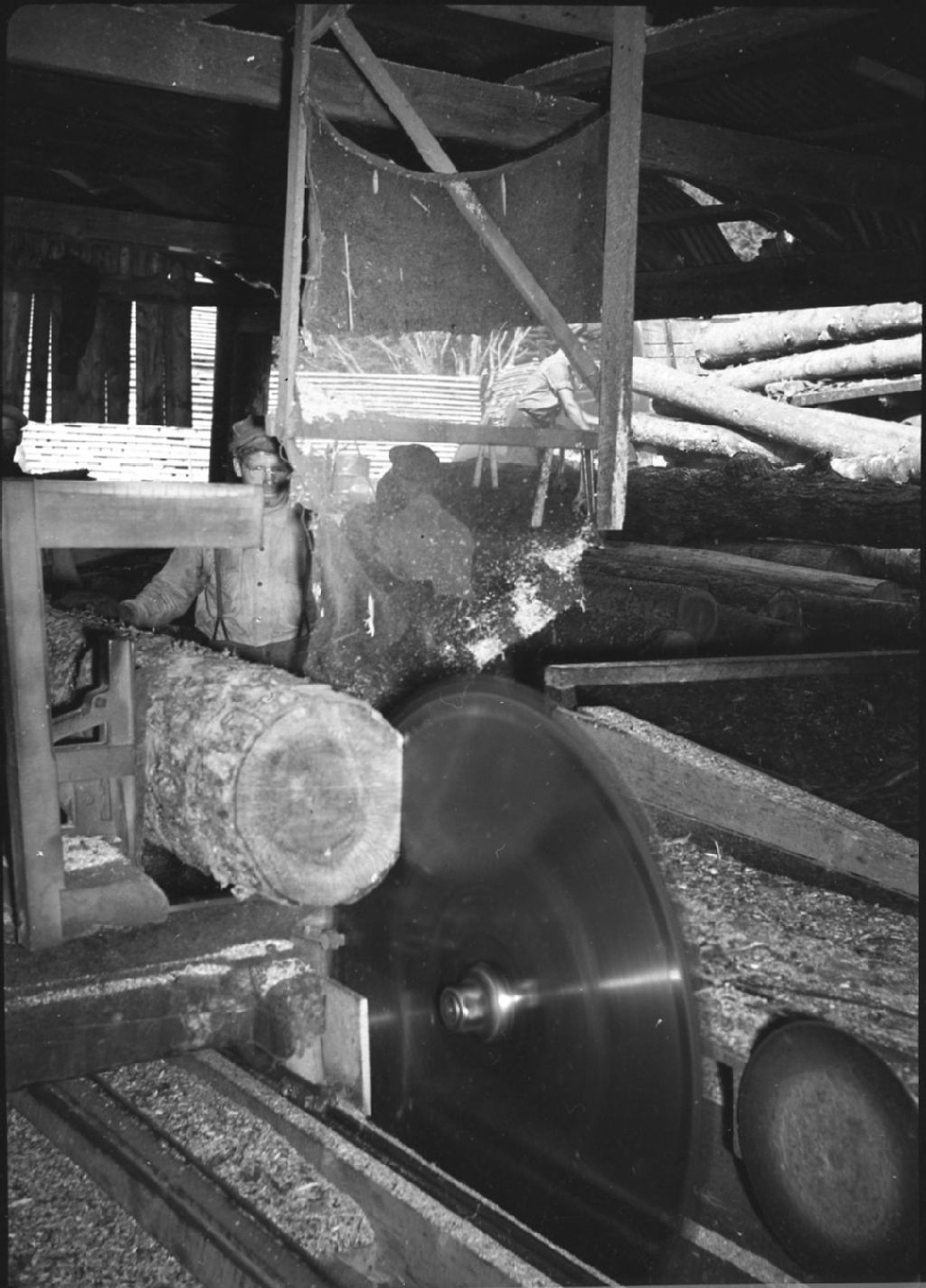 Hommes coupant du bois dans un moulin à l'aide d'une scie circulaire. Laval, Vers 1950, Archives nationales à Québec, Fonds George A. Driscoll, (03Q,P630,S5,D25351), George A. Driscoll.