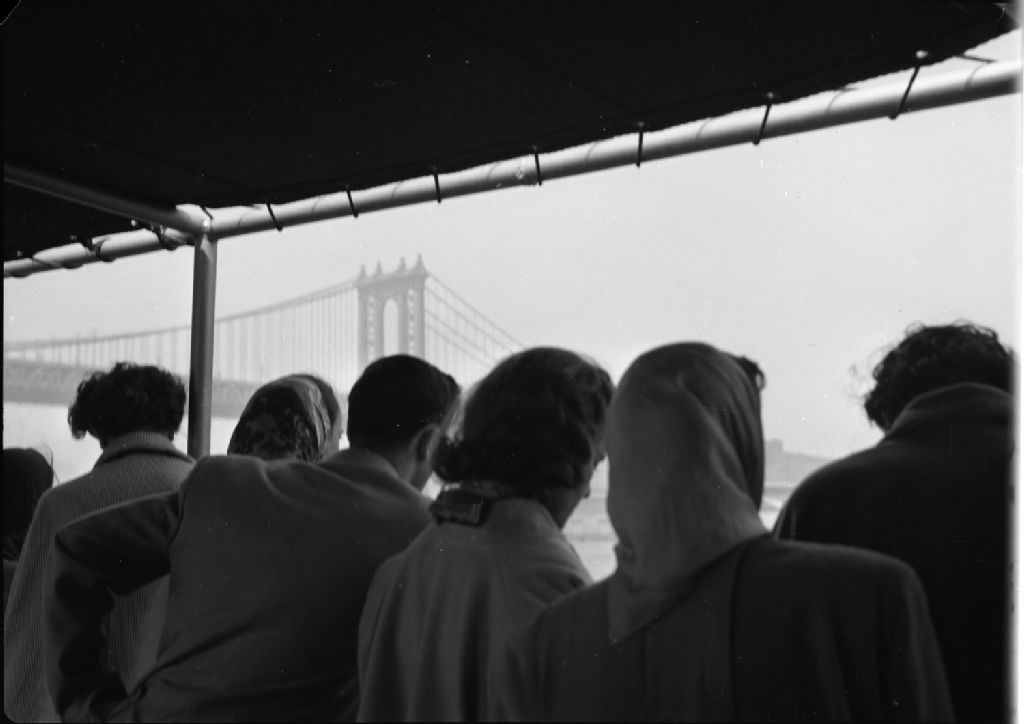 Groupe d'étudiants de l'institut Driscoll devant le pont de Brooklyn lors d'un voyage à New York