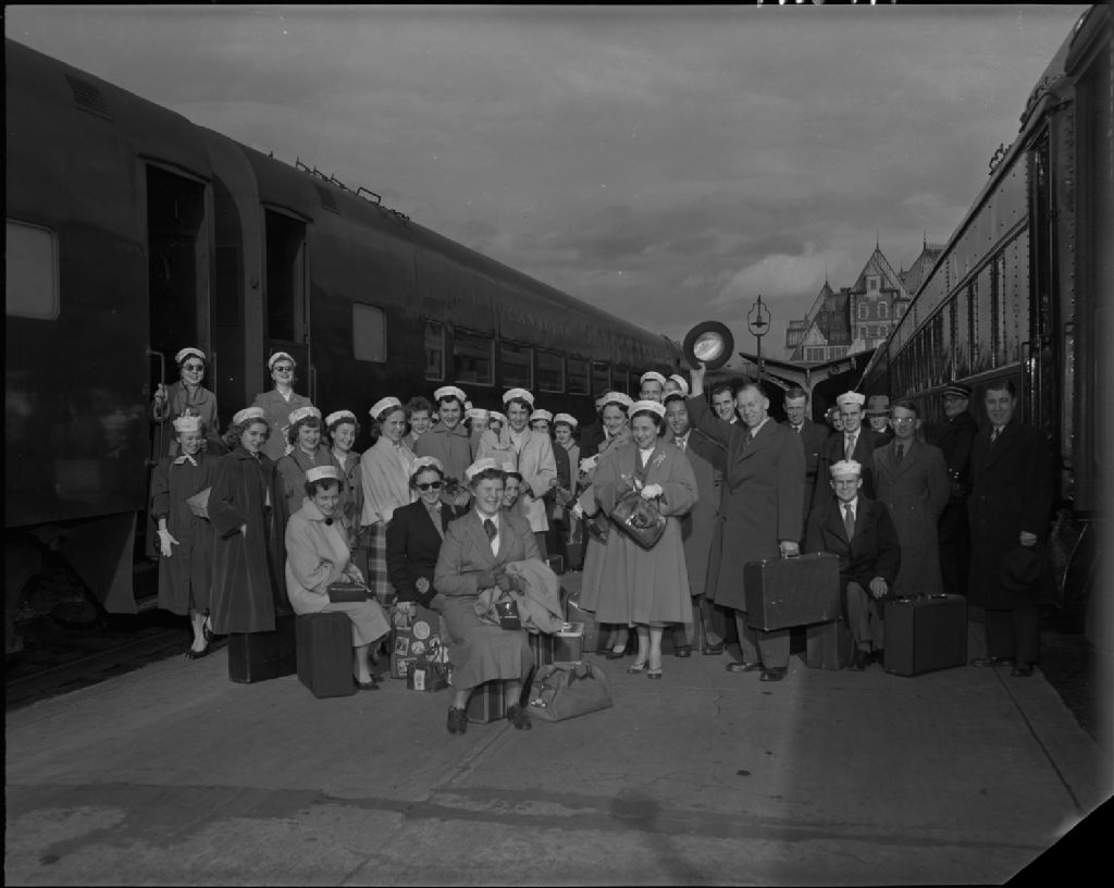 Portrait de groupe d'étudiants de l'institut Driscoll à la gare du Palais de Québec, Vers 1955, Archives nationales à Québec, Fonds George A. Driscoll, (03Q,P630,S6,D147), George A. Driscoll.
