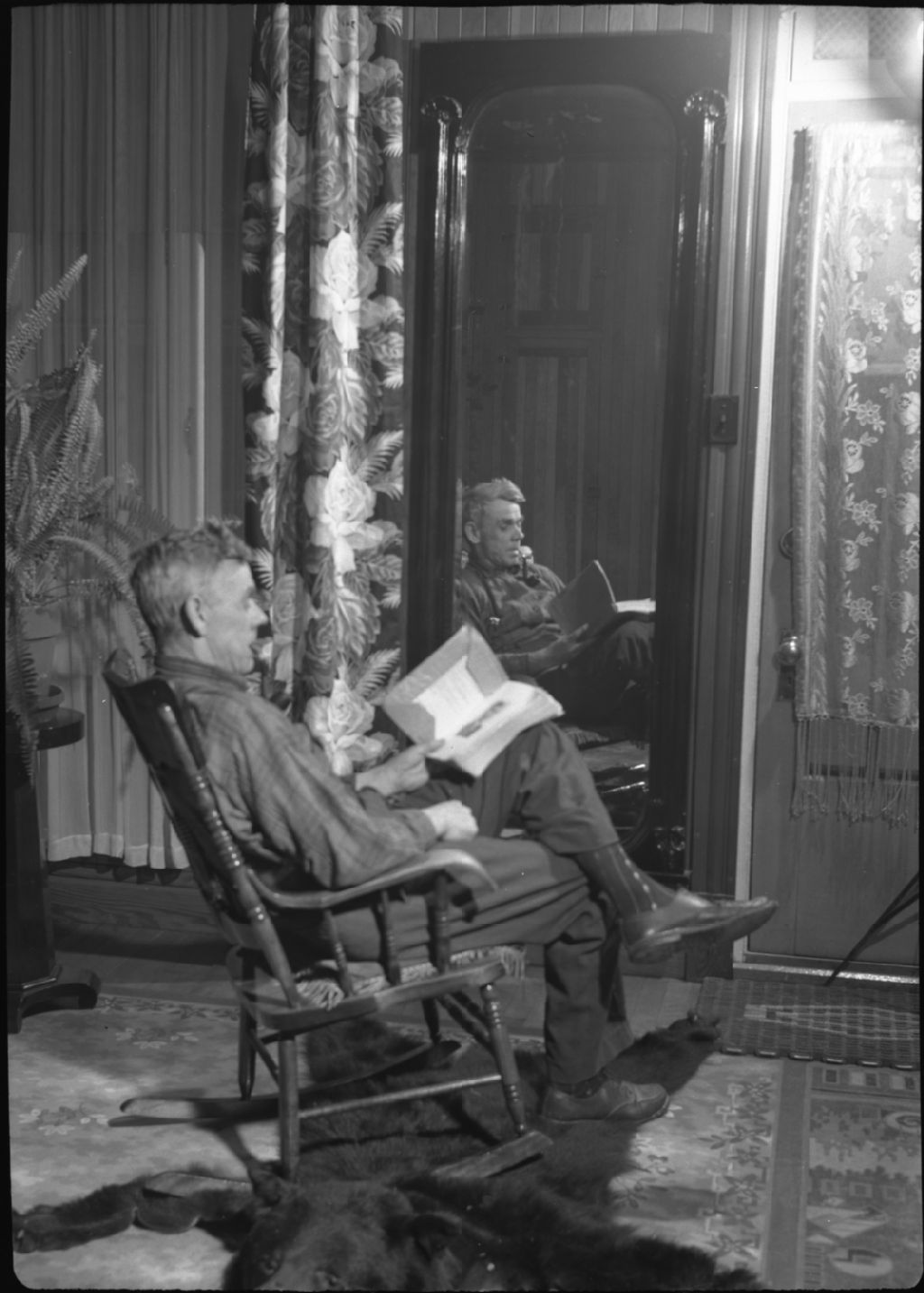Thomas-Louis Fortin lisant dans sa chaise berçante à Saint-Urbain, Vers 1955, Archives nationales à Québec, Fonds George A. Driscoll, (03Q,P630,S6,D4949), George A. Driscoll.