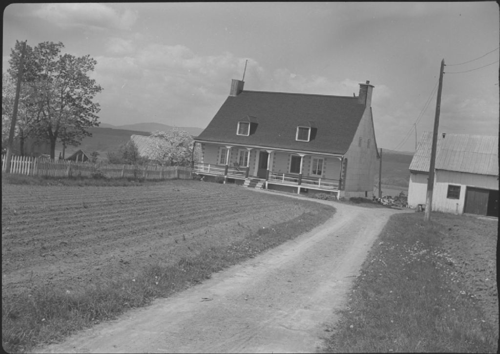 Ferme typique à l'Île d'Orléans. Champ en culture. Chemin et clôture au premier plan. Montmorency., Vers 1950, Archives nationales à Québec, Fonds George A. Driscoll, (03Q,P630,S7,D12051), George A. Driscoll.