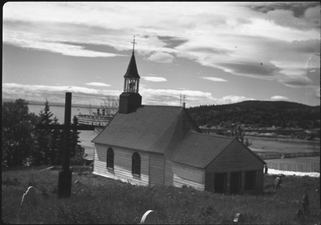 Vue arrière de la chapelle de Tadoussac. Bateau de la Canadian Steamship en arrière-plan