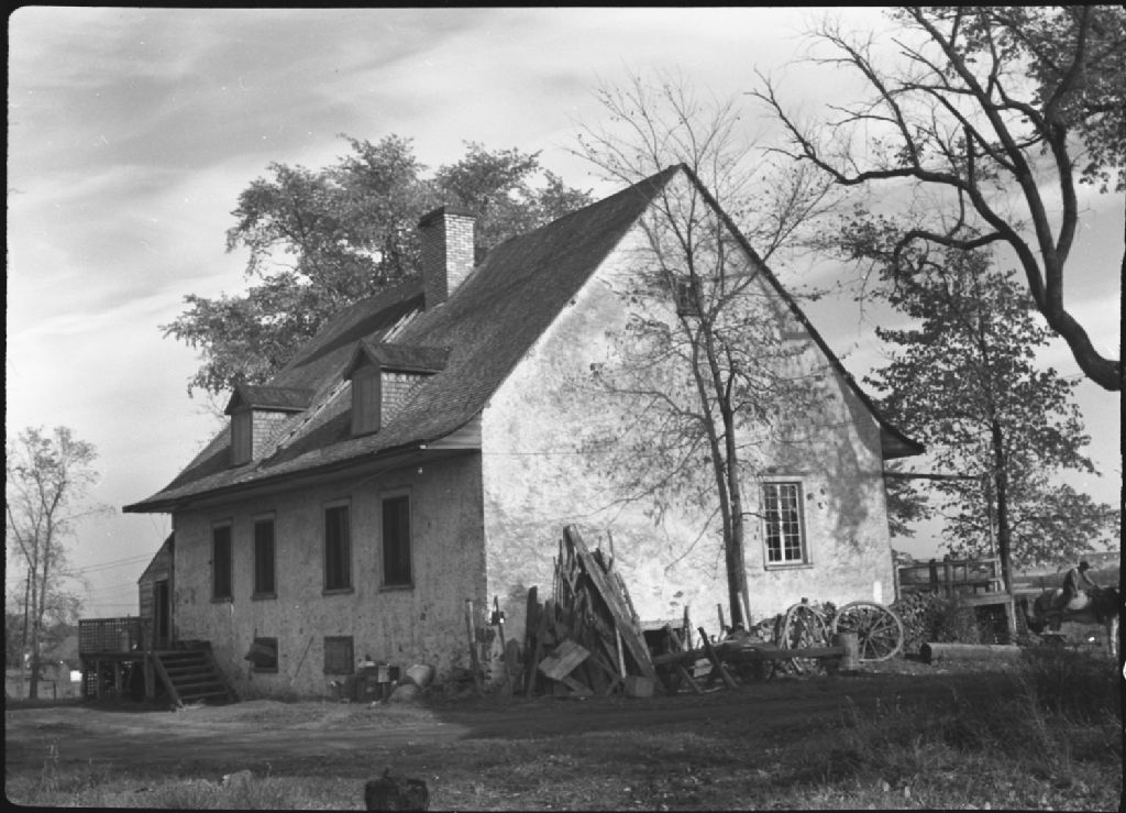 Maison «Chez Rochette». Gros plan. Débris de bois près de la maison. Homme sur un cheval en arrière de la maison. Lorette