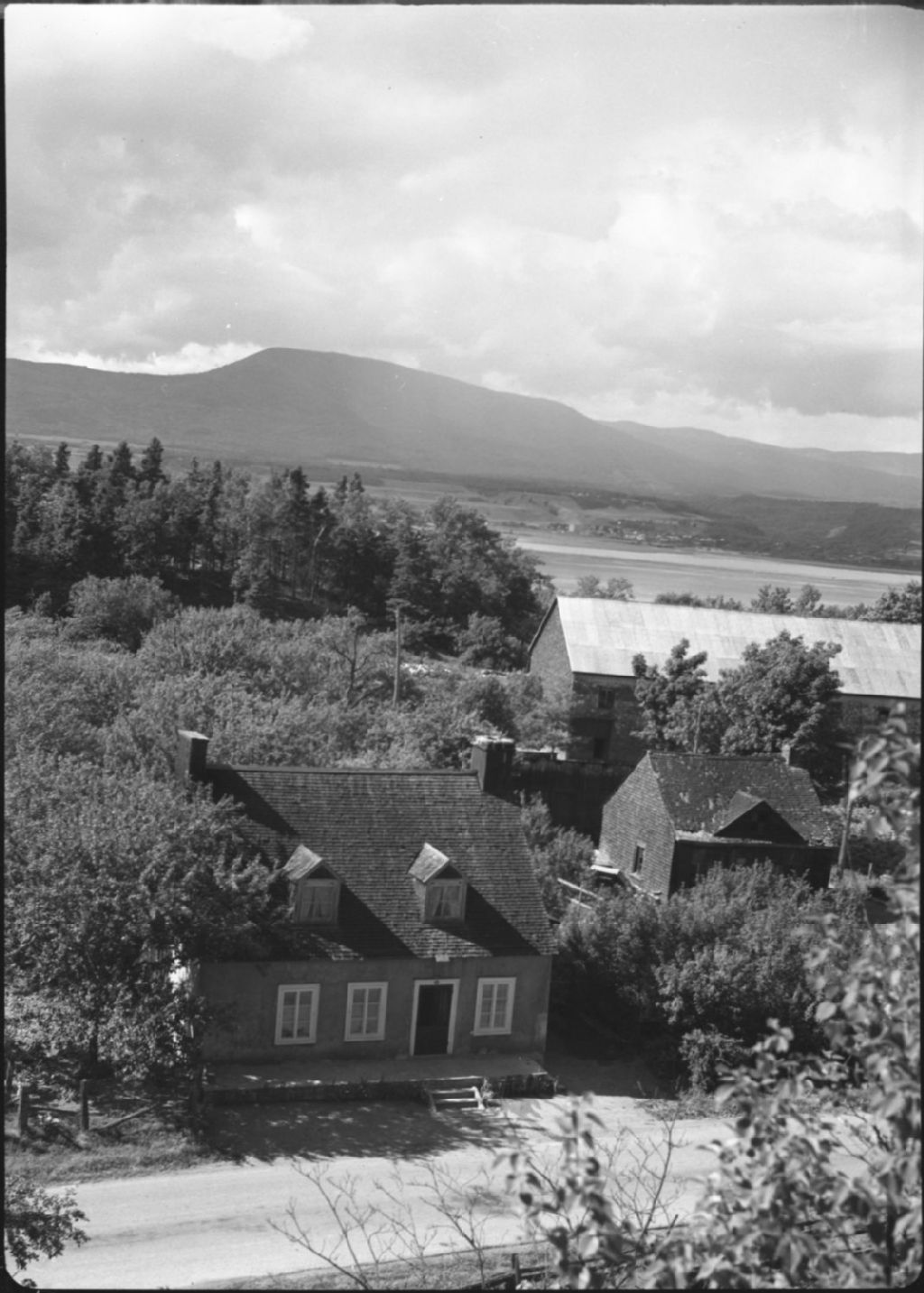 Ferme et dépendances dans le feuillage près de «Chez Michaud». Chemin passant devant la maison. Côté de Beaupré à l'arrière. Photo verticale prise du haut d'une colline. Saint-Pierre, Île d'Orléans. Montmorency.