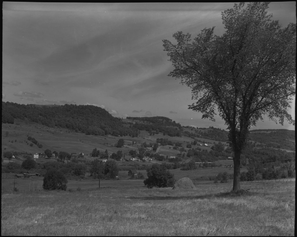 Versant de montagne boisée à Saint-Benoit-du-Lac. Maisons. Arbre et foin au premier plan