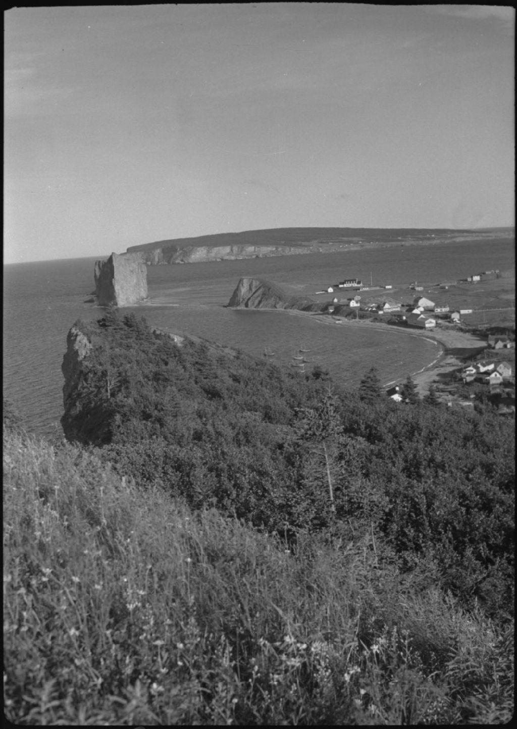 Le rocher Percé, l'Île Bonaventure et une partie du village vus du cap de l'Aurore