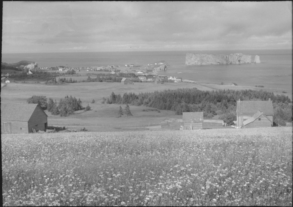 Vue d'ensemble de Percé et du Rocher. Champs à l'avant-plan, Vers 1950, Archives nationales à Québec, Fonds George A. Driscoll, (03Q,P630,S8,D51851), George A. Driscoll.