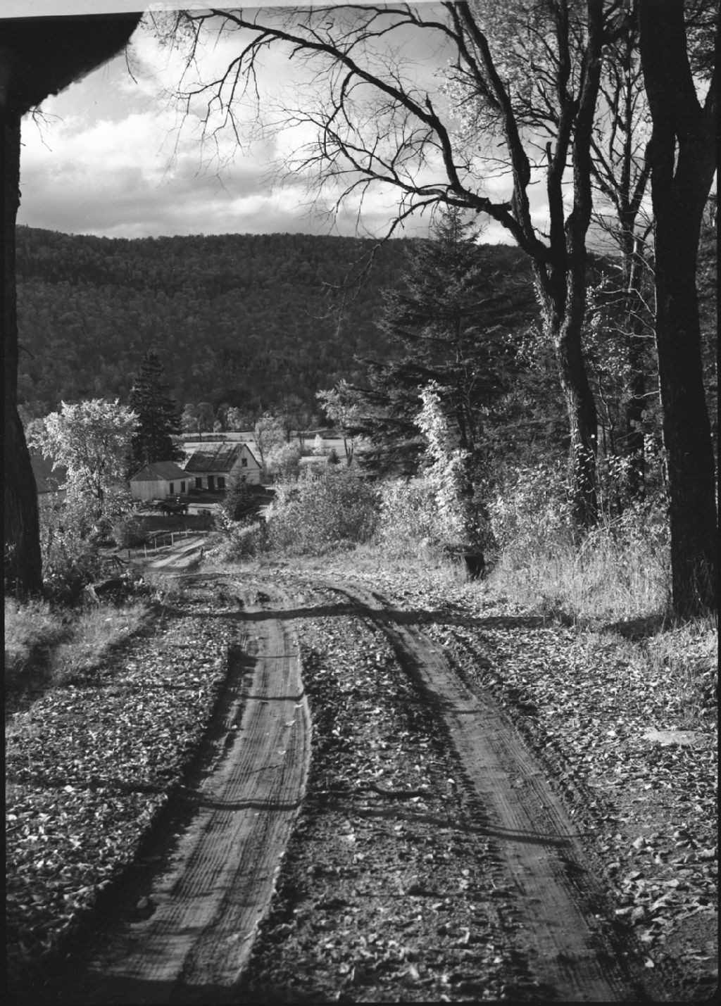 Chemin de campagne en automne. Feuilles mortes et maison au loin. Tewkesbury, Vers 1950, Archives nationales à Québec, Fonds George A. Driscoll, (03Q,P630,S8,D67449), George A. Driscoll.