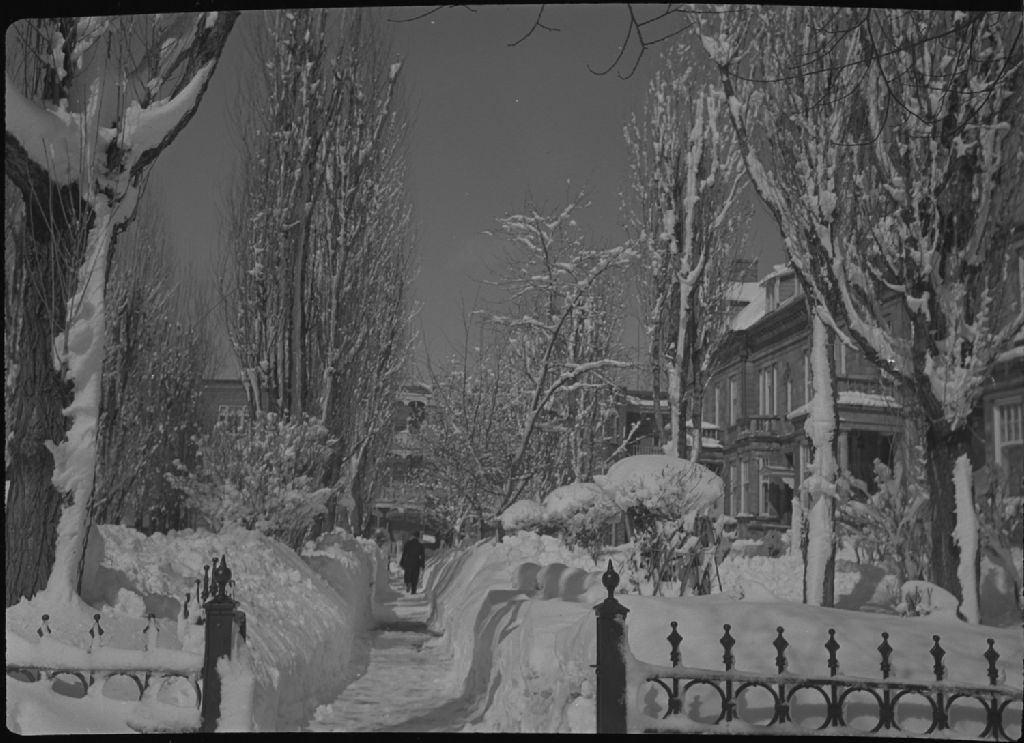 Maisons et arbres enneigés., Vers 1950, Archives nationales à Québec, Fonds George A. Driscoll, (03Q,P630,S9,D70151), George A. Driscoll.