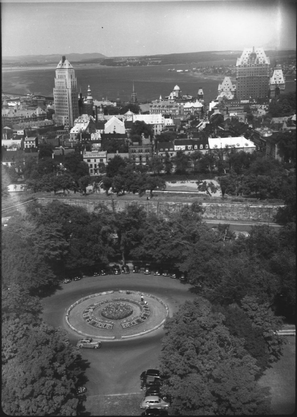 Vue de la tour du parlement : rond point, fortifications, Vieux-Québec, Château Frontenac et Édifice Price