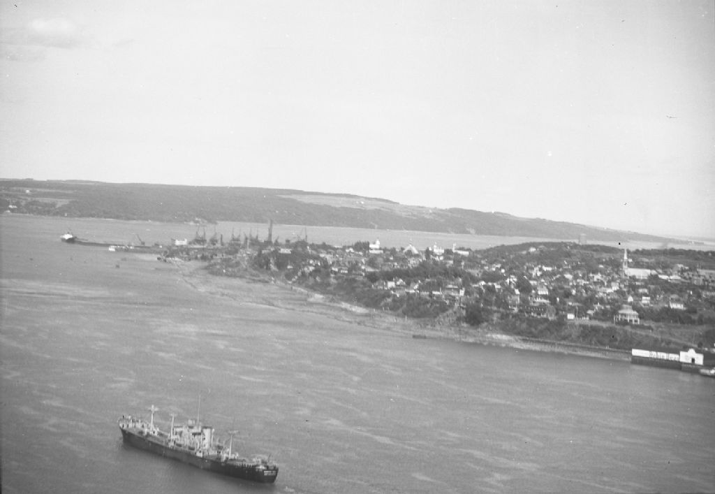 Pointe-Lévis vu du Château Frontenac, bateau de guerre sur le fleuve Saint-Laurent, Île d’Orléans à l’arrière-plan. Québec