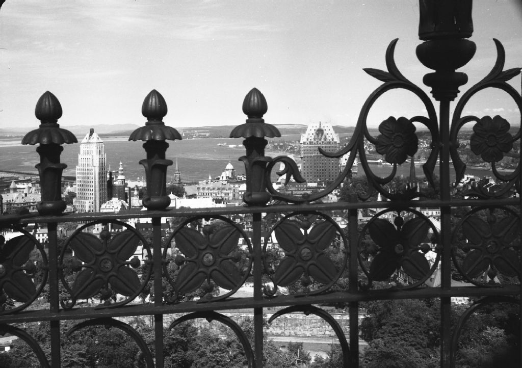 Vue générale de Québec à travers une grille dans la tour du parlement